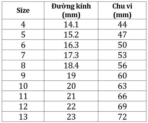 - Quý khách đối chiếu số mm của thước với kích thước đường kính của bảng kích thước dưới nhẫn dưới đây.