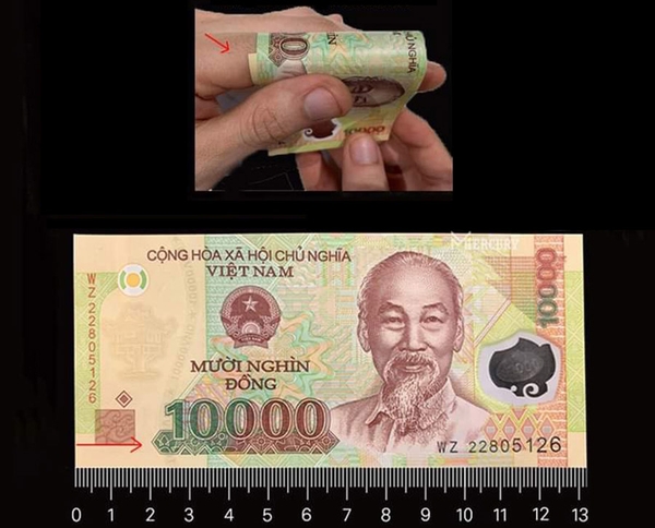 P/s: Nếu không thể tìm đc nguyên liệu cần thiết bạn cũng có thể sử dụng ngay tờ 10.000 VNĐ để thay thế cho mảnh giấy 10cm để đo thực hiện tương tự như cách 1. Sau đó ướp vị trí giao nhau giống như hình dưới để biết được chu vi ngón tay và chọn size theo bảng trên.